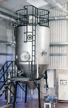 噴霧干燥設備是一種新型高效干燥工藝設備,它可以使溶液,乳濁液,懸浮液,熔融液或膏糊狀物,經(jīng)噴霧干燥,一般在幾秒鐘內蒸發(fā)水份,轉變?yōu)榉仙a(chǎn)要求的粉狀、顆粒狀、空心球或圓粒狀產(chǎn)品?諝馔ㄟ^(guò)加熱器轉化為熱空氣進(jìn)入裝置在干燥室頂部的熱風(fēng)分配器然后均勻地進(jìn)入干燥室內,并呈螺旋狀轉動(dòng),同時(shí)將料液送至裝置在干燥室頂部的離心霧化器,將料液噴成極小的霧狀液滴,使料液和熱空氣并流接觸,水份迅速蒸發(fā),在極短的時(shí)間內干燥為成品。成品連續地由干燥塔底部和旋風(fēng)分離器中輸出,廢氣由風(fēng)機排空。 |